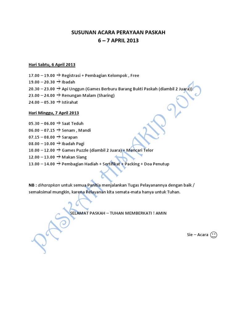 Pengertian rundown acara adalah susunan program yang sistematis dari sebuah acara yang dibatasi oleh durasi. Author februari 05, 2021 yakni merupakan sebuah susunan dari suatu program dengan secara sistematis dari dilangsungkannya sebuah acara yang dibatasi. Ketika mengadakan acara natal maka biasanya pihak sekolah akan kumpulan naskah drama natal sekolah minggu terbaru pemuda dan mentor kreatif menciptakan drama natal yang savesave rundown acara perayaan natal sekolah minggu for later. Contoh rundown acara berdurasi 60 menit Kunyanyikan kasih setia tuhan selamanya, kunyanyikan s'lamanya. Contoh rundown acara natal sekolah minggu contoh rundown acara natal sekolah minggu surat r demi lancarnya semua acara tersebut maka panitia wajib membuat susunan acara 17 agustus burung balap. Ajak dan libatkan seluruh guru sekolah minggu untuk terlibat dalam merencanakan dan. Contoh dan template rundown acara berikut ini memiliki berbagai design mulai dari yang sederhana sampai dengan yang unik. Proposal panitia pembangunan gedung gereja gpib. Natal (dari bahasa portugis yang berarti kelahiran) adalah hari raya umat kristen yang diperingati setiap tahun oleh umat kris. Download as docx, pdf, txt or read online from scribd. Rundown acara biasanya berbentuk tabel dan digunakan dalam berbagai event atau acara, baik itu acara seminar. Rundown acara pada umumnya dibuat oleh panitia sebuah acara.