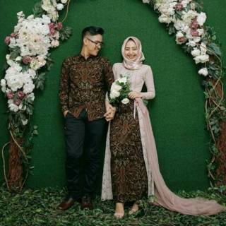 Baju Tunangan Couple Modern : Salah satu model baju tunangan yang cantik yaitu saat perempuan memakai kebaya hijab dipadukan dengan baju batik pria yang serasi.